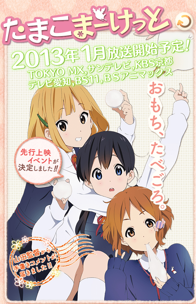 京阿尼新作TV动画《たまこまーけっと》即将于明年1月9日放送,本作以商店街和学校为舞台,讲述了一个珍视人与人之间的羁绊,温暖温馨的青春物语。目前官网已放出人设,声优等相关情报。 本作是山田尚子、吉田玲子、堀口悠纪子(轻音部分人设)、京阿尼联手打造的完全新作。 【故事简介】 兔子山商店街饼屋家高中一年级女孩北白川玉子是这部作品的主人公,她深爱着自己制作的饼以及她出生的这条商店街。年末,正式商店街最繁忙的时候,一只神奇的鸟儿突然登场,它可以听懂人类的语言,就这样住在了玉子的家中。 鸟儿的到来为这个忙碌的年末更添了一份热闹和欢愉。 【人物介绍】 北白川玉子(CV:洲崎绫) 本作主人公,兔子山商店街饼店“玉屋”家的女儿,高中一年级,开朗活泼,心肠好。接力棒部成员,非常喜欢吃饼,性格有点天然,但是做饼的手艺确是天才级的。 常磐绿(CV:金子有希) 玉子的同学兼青梅竹马,接力棒部成员。祖父母在兔子山商店街开茶店,平时对玉子很照顾,时不时还会来两句有爱的吐槽。 牧野かんな(CV:长妻树里) 玉子的同学,接力棒部成员,是兔子山商店街木工店家的女儿,店铺生意一直很好,受此影响,她平时很在意建筑物的垂直度,经常测量一番,平时有点my pace,大大咧咧。 鸟 来自南国,能听懂人话,寄居在玉子家中,它的目的究竟是……? 北白川あんこ(CV:日高里菜) 玉子的妹妹,小学4年级打扮很时尚,觉得自己开饼店的家业有点土。 大路饼藏(CV:田丸笃志) 玉子的同学,青梅竹马,家里也开着一家饼店,叫做“大路屋”,位于“玉屋”对面,电影研究会成员。 朝雾史织(CV:山下百合惠) 玉子的同学,很冷酷,性格很认真,羽毛球部成员。 【STAFF】 监督:山田尚子 系列构成:吉田玲子 角色设计:堀口悠纪子 色彩设计:竹田明代 美术监督:田峰玉子 摄影监督:山本伦 设定:秋竹齐一 音响监督:鹤冈阳太 音乐:片冈知子 动画制作:京都动画 制作:兔子山商店街 |